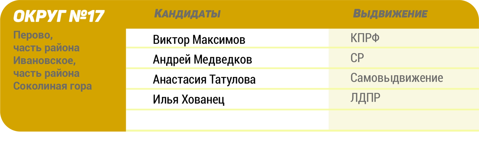 Не прошли на выборы Дмитрий Зенов («Коммунисты России») и Елена Славинская (самовыдвижение). 17-й округ оказался одним из немногих округов, которые не заинтересовали ни одного из независимых кандидатов: здесь не выдвигались ни яблочники, ни соратники Алексея Навального и Дмитрия Гудкова.