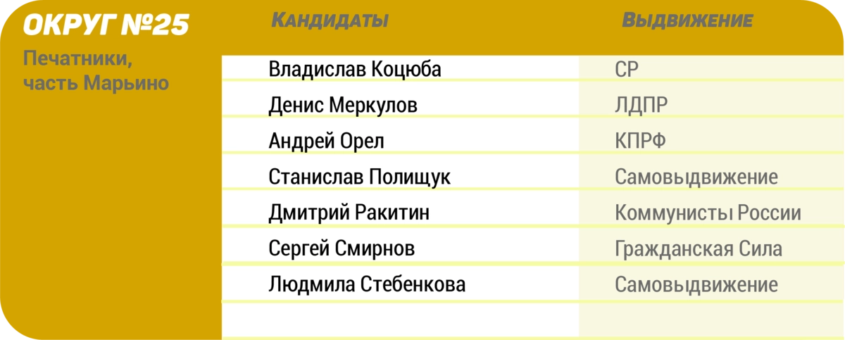 Если предыдущие задачи на внимательность показались вам слишком легкими, присмотритесь к именам кандидатов по 25-му округу. Начнем с простого: кандидатов Власова и Власова избирателю можно уже не различать — они оба не прошли на выборы. Теперь посложнее: кандидаты Сергей Смирнов и Сергей Смирнов. Один из них — незарегистрированный самовыдвиженец, второй — зарегистрированный кандидат от «Гражданской силы».