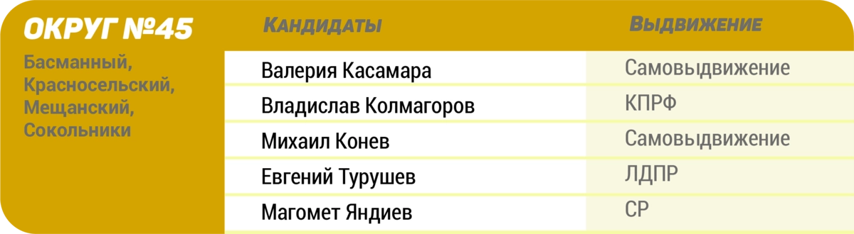 Еще один «неспокойный» округ, регистрацию в котором не получили Федор Бирюков («Родина»), Никита Остранков («Коммунисты России») и Юрий Руднев («Национальный курс»), а также самовыдвиженцы Вячеслав Борисов, Мария Коледа, Алексей Ретеюм, Виталий Семененко, Юлия Серебрянская и Илья Яшин.