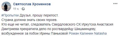 «Следователь Свердловского СК Иркутска Анастасия Дмитриева прекратила дело по росгвардейцу Шишминцеву, возбужденное за побои Ирины Паньковой», - написал он.