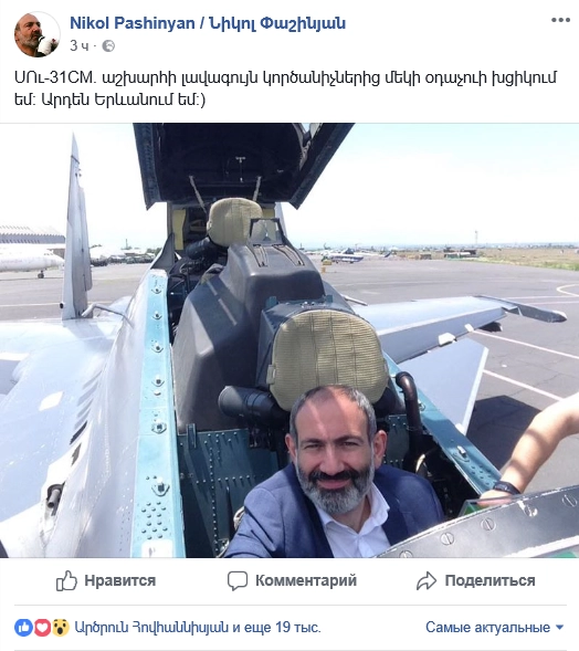«В кабине пилота одного из лучших истребителей в мире. Я уже в Ереване», — написал армянский премьер на своей странице в Facebook под размещенной там фотографией.