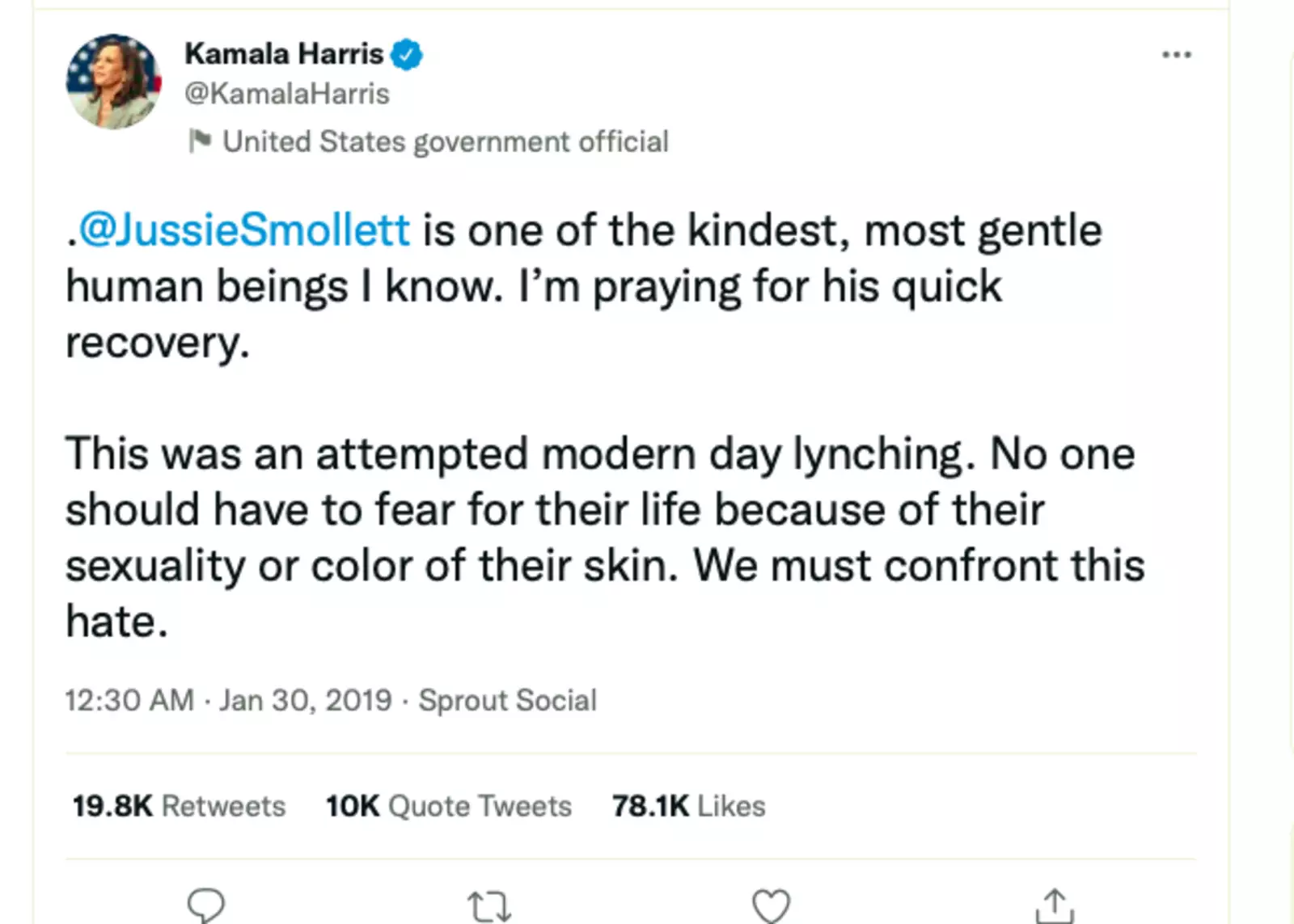 Хор в поддержку жертвы расизма объединил абсолютно всех псевдолиберальных представителей политической и голливудской элиты, кричавшей в соцсетях о том, что Смоллетта пытались линчевать. Будущий вице-президент Камала Харрис писала твиты в поддержку, называя «жертву» самым прекрасным и милым человеком. «Мы должны все вместе противостоять этой ненависти!» — патетически восклицала она.