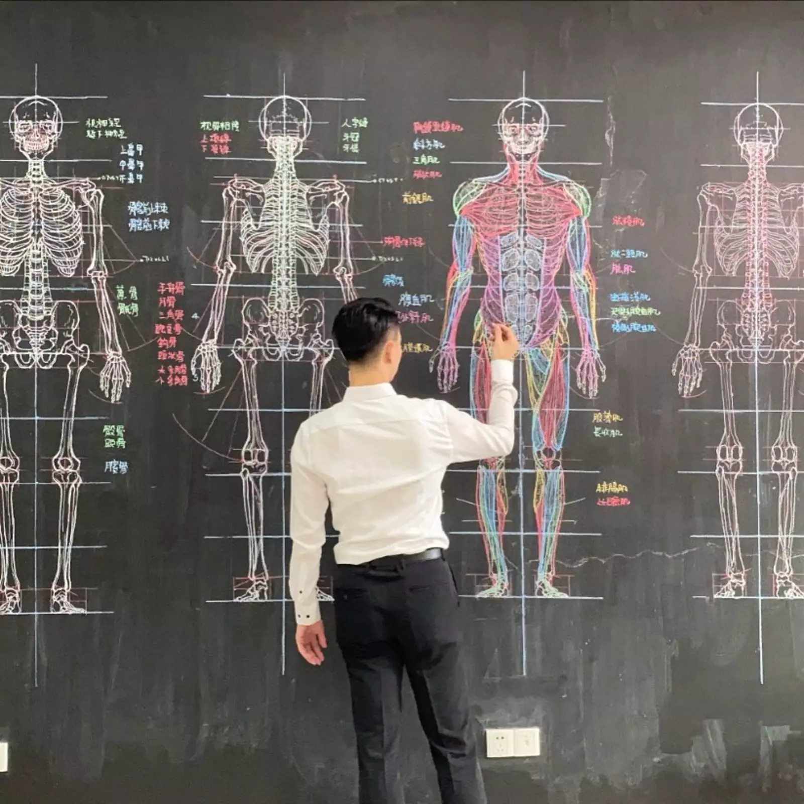 Чжун Цюаньбинь привлек внимание тысяч пользователей соцсетей своими невероятно подробными анатомическими рисунками, которые он создает, используя только линейку и цветные мелки.