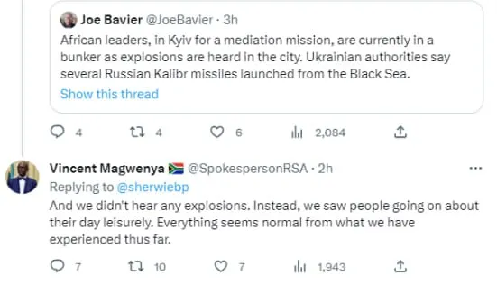 Пресс-секретарь президента Южно-Африканской Республики Винсент Магвенья назвал «дезинформацией и неправдой» сообщения украинских СМИ о российской ракетной атаке на Киев во время нахождения в городе делегации ЮАР.