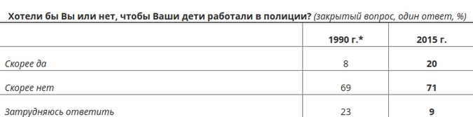 Примечательно, что престижность профессии сотрудника полиции существенно возросла со времен позднего СССР. Если в 1990 году видеть в будущем своих детей в рядах полиции хотел лишь каждый десятый, то сегодня — уже каждый пятый (20%):