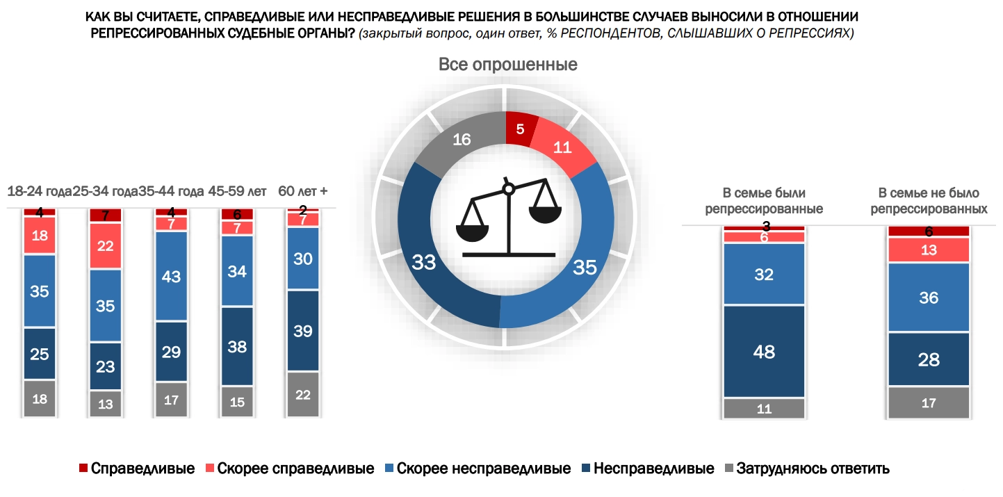 Согласно социологическому исследованию, проведенному ВЦИОМ, само понятие «сталинские репрессии» знакомо подавляющему большинству россиян, однако оценка справедливости судебных решений по делам репрессированных существенно разнится.