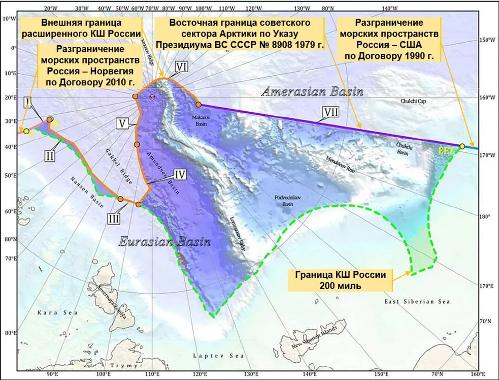 Территории заявленных американцами претензий в Арктике и в Беринговом море расположены к востоку от водораздела морских пространств между СССР и США, установленного двусторонним соглашением от 1990 года. Это та самая «линия Шеварднадзе — Бейкера», споры о которой не утихают более тридцати трёх лет, вплоть до предложений о денонсации, тем более что договор этот так и не был нами ратифицирован.