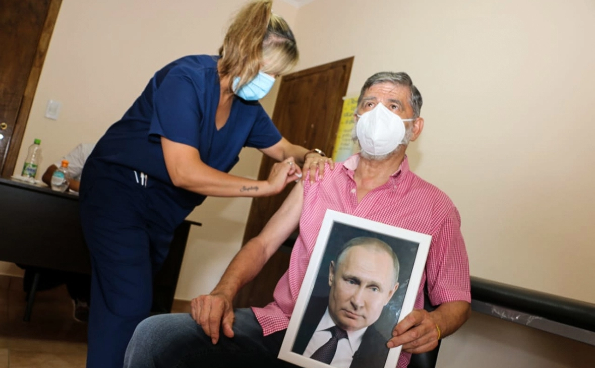 Мэр аргентинского города Роке Перес в провинции Буэнос-Айрес Хуан Карлос Гаспарини сделал прививку «Спутником V» с портретом Владимира Путина в руках © Municipio de Roque Pérez / Facebook