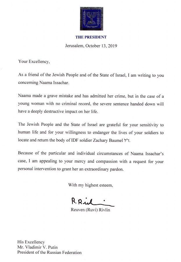 Президент Израиля Реувен Ривлин обратился к президенту РФ Владимиру Путину с просьбой о помиловании израильтянки Наамы Иссахар, которую Химкинский суд 11 октября приговорил к семи с половиной годам колонии за контрабанду наркотиков.