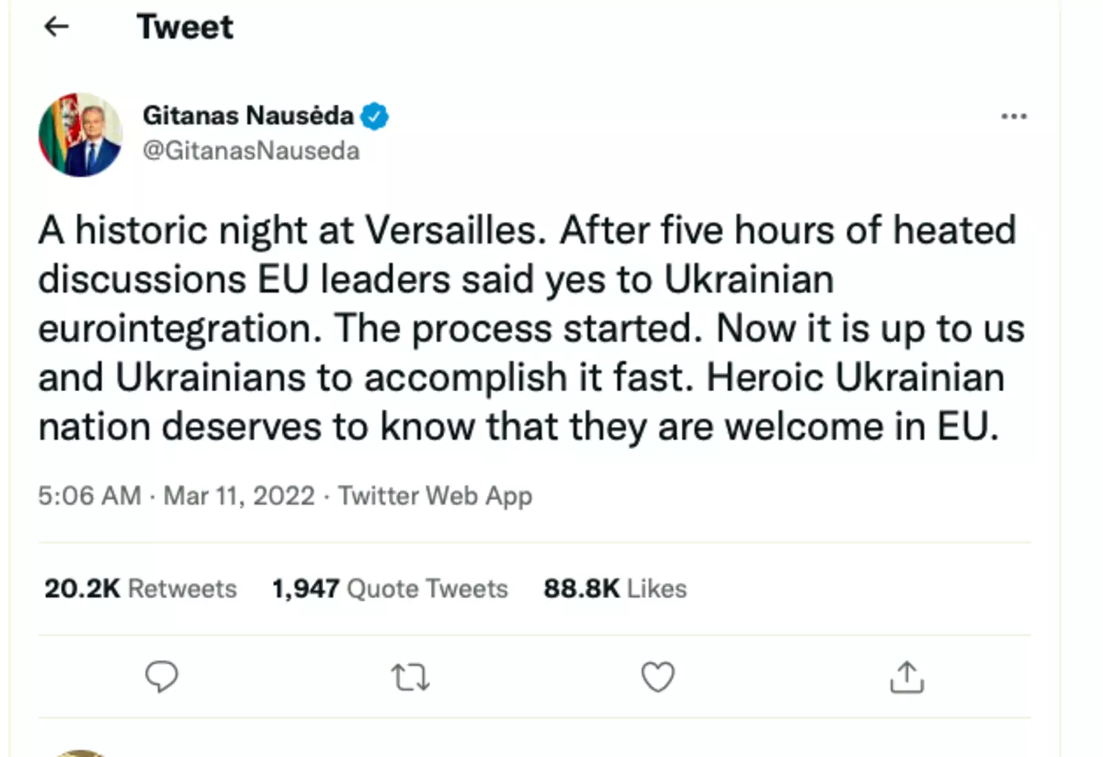 «Историческая ночь в Версале. После пяти часов горячих дискуссий лидеры ЕС согласились на украинскую евроинтеграцию. Процесс начался. Теперь мы и украинцы должны сделать это быстро. Героическая украинская нация заслуживает того, чтобы знать, что она приветствуется в ЕС», — написал Гитанас Науседа.