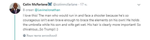 «Держит зонтик, пока его жена и сын мокнут под дождем! Его прическа явно важнее», — написал актер Колин МакФарлэйн.