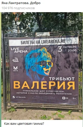 Ранее депутат Лантратова опубликовала в своём Telegram-канале выдержанной в «неприятельских» тонах снимок афиши концерта Валерии в Москве с подписью: «Как вам цветовая гамма?»