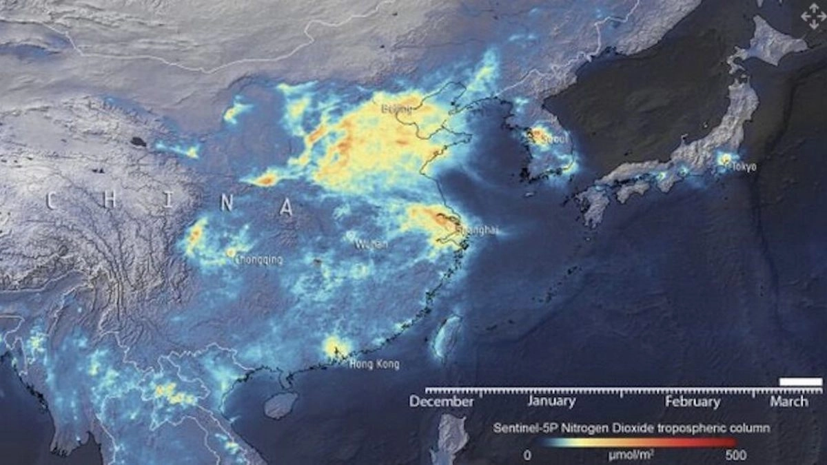 Поскольку двуокись азота в основном производится транспортными средствами и заводами, она является показателем первого уровня промышленной активности во всем мире. То, что хорошо видно, — это значительное снижение уровня диоксида азота над Китаем, вызванное снижением активности из-за карантина, а также китайского Нового года, который был в конце января.
