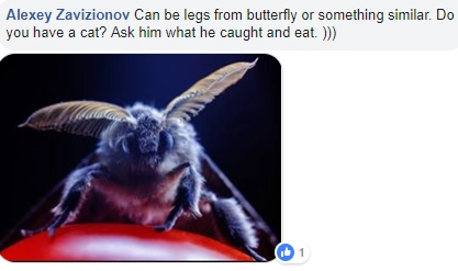 «Может быть, ножки от бабочки или что-то подобное. У вас есть кошка? Спросите ее, что она поймала и съела».