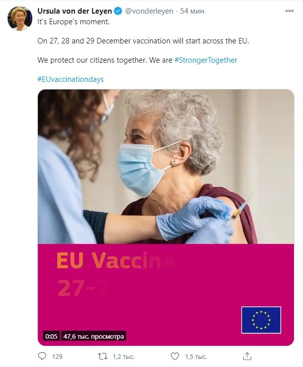 Пришло время Европы. 27, 28 и 29 декабря по всему ЕС начнется вакцинация. Вместе мы защитим наших граждан. Вместе мы сильнее, — написала фон дер Ляйен в Twitter-аккаунте.