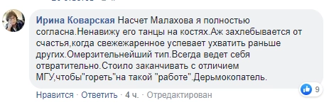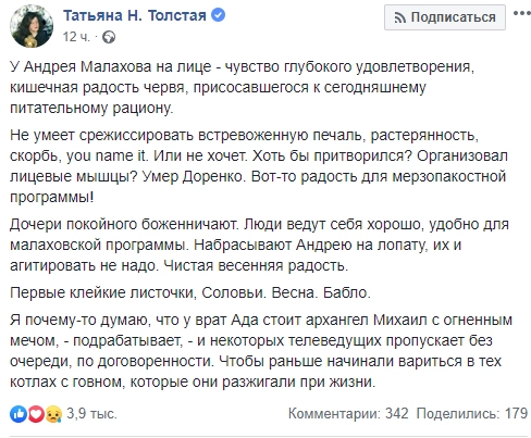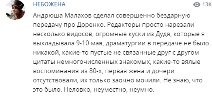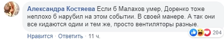 Реакцию Андрея Малахова на трагическое событие бывшая ведущая «Школы злословия» оценила как нескрываемую «радость червя», а дочерей Доренко обвинила в том, что они «набрасывают на лопату» ведущему.