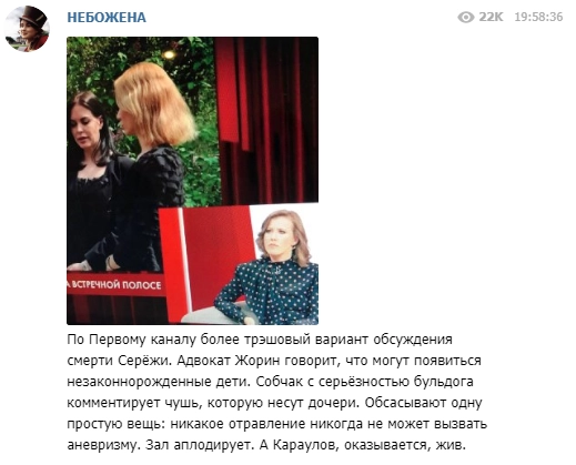 Впрочем, светская львица нашла и «еще более трэшовый» вариант программы о Доренко — передачу, вышедшую на Первом канале. Рынска поделилась впечатлениями и о ней.