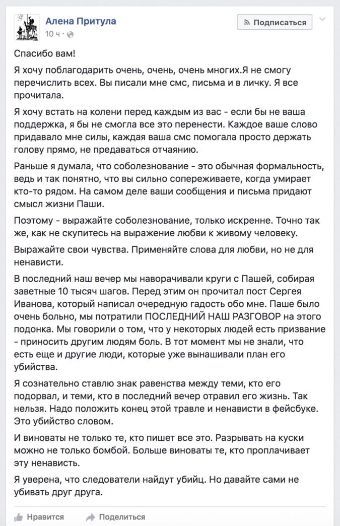 «Я сознательно ставлю знак равенства между теми, кто его подорвал, и теми, кто в последний вечер отравил его жизнь. Так нельзя. Надо положить конец этой травле и ненависти в фейсбуке. Это убийство словом», — написала она на своей странице в Facebook.