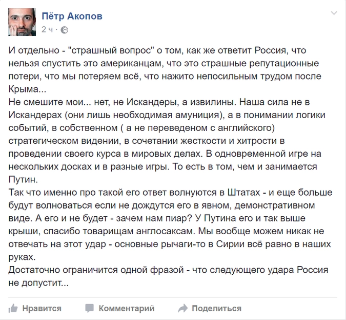 Американские «Томагавки» внесли смятение в ряды российских пользователей соцсетей. Люди окончательно разочарованы в Дональде Трампе, на которого некогда возлагали надежды по поводу улучшения российско-американских отношений, и теперь во всю думают, чем Россия ответит на сюрприз «мирового жандарма».