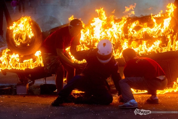 Заключительный трюк исполнил лично организатор шоу и постановщик трюков Игорь Master Панин. Он разогнал горящий «Мерседес» и завел его на узкий трамплин-рейку. Машина взмыла в воздух и рухнула на крышу. Маэстро не пострадал, а вот из автомобиля полился тосол.