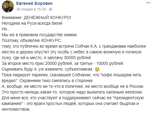 Впрочем, обещание заплатить 30 тысяч рублей тому, «кто публично и наиболее жестко и дерзко опустит Собчак с небес в самую вонючую и поганую лужу, где ей и место», противозаконным не признали.