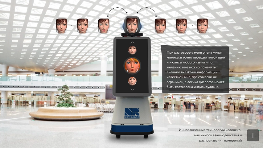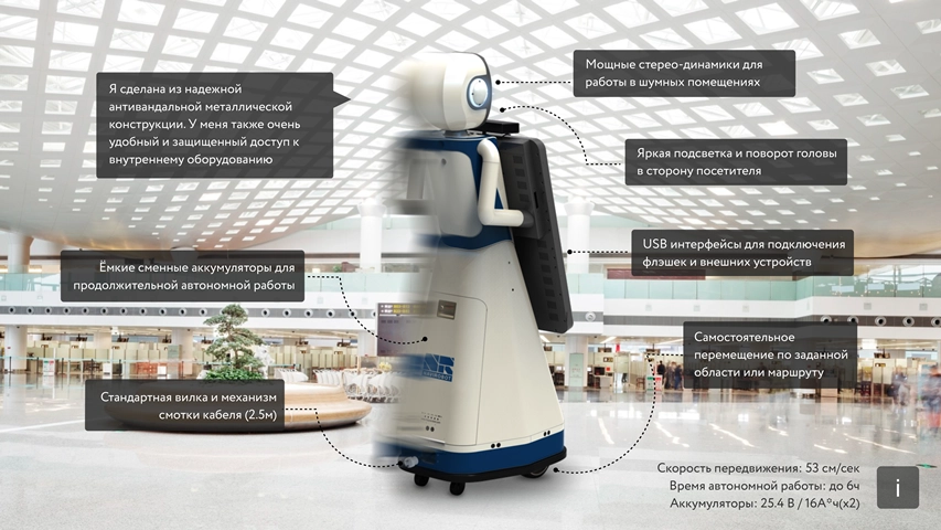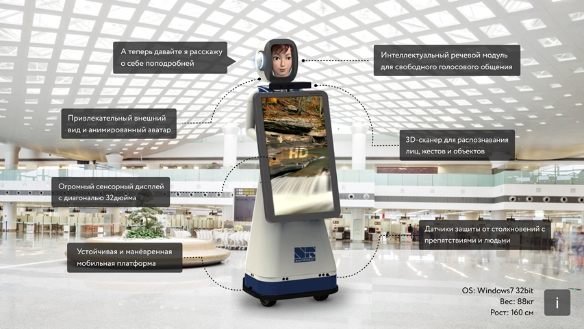 Благодаря технологиям распознавания людей, искусственному интеллекту и подключению к Интернету робот способен эффективно и автономно обслуживать людей в режиме онлайн: регистрировать гостей, узнавать постоянных клиентов, принимать заказы и оплату, предлагать таргетированные товары, распечатывать купоны, билеты и посадочные талоны; получать обратную связь и анализировать маркетинговые данные.