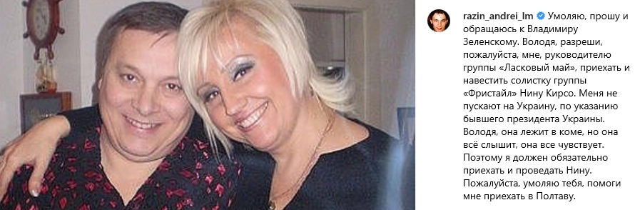 Меня не пускают на Украину по указанию бывшего президента Украины. Володя, она лежит в коме, но она все слышит, она все чувствует. Поэтому я должен обязательно приехать и проведать Нину, — написал продюсер в своем аккаунте в Instagram.