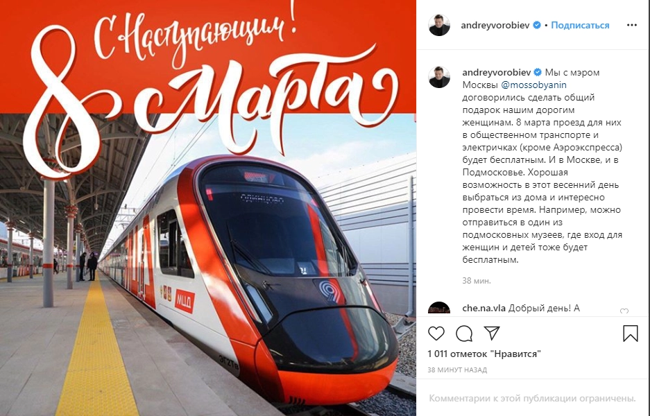 8 марта женщины смогут не покупать билеты на автобусы, троллейбусы, трамваи, метро, МЦК, МЦД и даже на пригородные электрички. Исключением станет только проезд на аэроэкспрессах, следующих до аэропортов. На них стоимость проезда останется прежней.