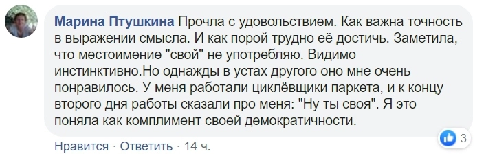 Поздравил знакомую с днем рождения в ЕЕ хронике. Фейсбук автоматически извещает: вашей знакомой «нравится ваша публикация в СВОЕЙ хронике». Очевидно, что ФБ-программа нуждается в перенастройке, в замене неуместного в таких случаях местоимения «свой» на местоимения «ее»/«его», — написал он в своем посте.