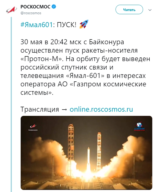 Произведен запуск ракеты «Протон-М» с российским спутником «Ямал-601»