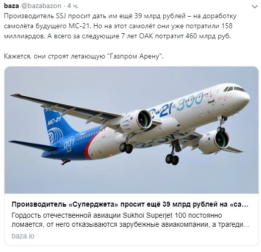Президент «Объединенной авиастроительной корпорации» (ОАК) Юрий Слюсарь в марте 2019 года обратился в правительство России с просьбой выделить дополнительные 39 миллиардов рублей на разработку среднемагистрального самолета МС-21, сообщает Baza.