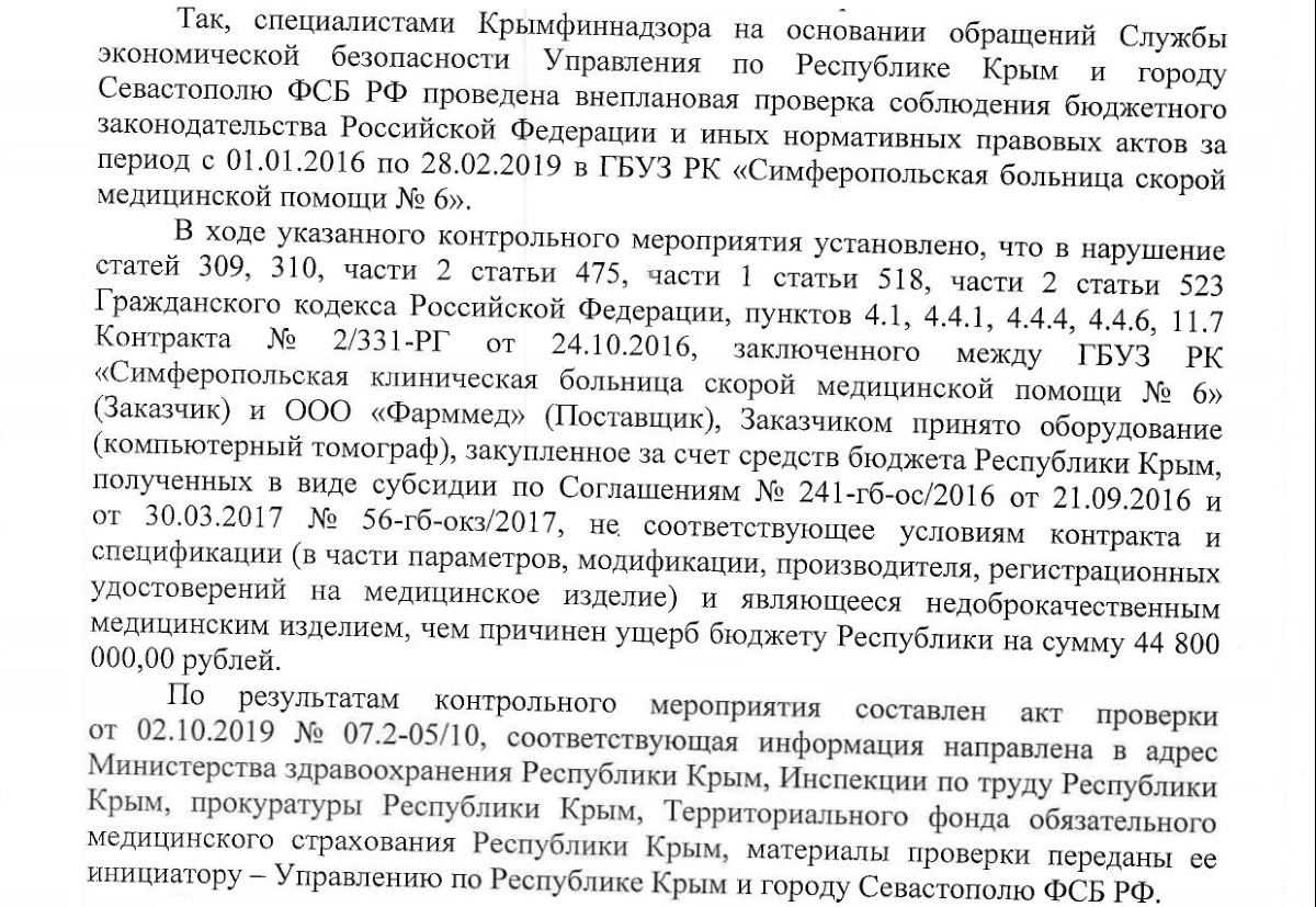 Приобретение некачественного оборудования обошлось бюджету Республики Крым в 44,8 млн. рублей, однако возмещать причинённый государству ущерб в соответствии с бюджетным кодексом России должна больница, но вовсе не лица, допустившие нарушение законодательства в сфере закупок.