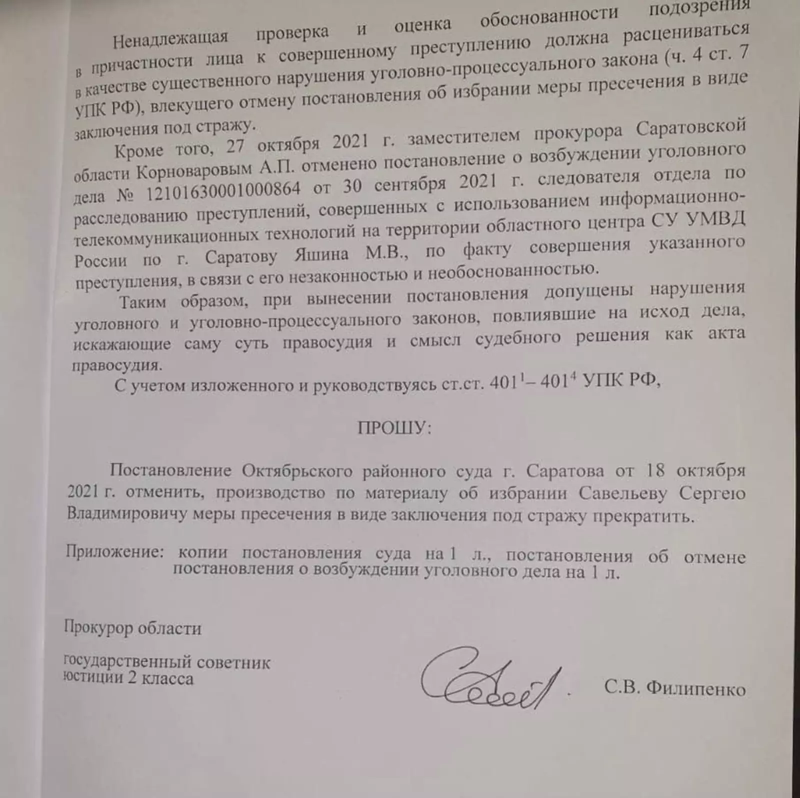 Его обвиняли в незаконном получении доступа к охраняемой законом информации. Накануне прокурор Саратовской области Сергей Филипенко обжаловал заочный арест Савельева. Из постановления, подписанного заместителем ведомства по региону Андрея Корноварова следует, что уголовное дело против мужчины было «возбуждено преждевременно, а обстоятельства возможного преступления не выяснены», рассказали правозащитники.