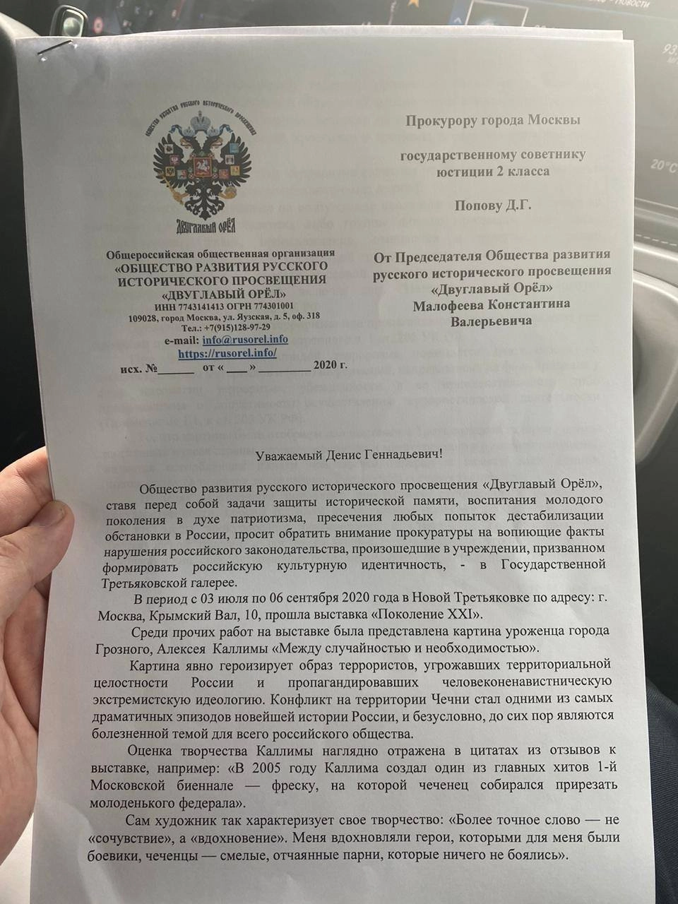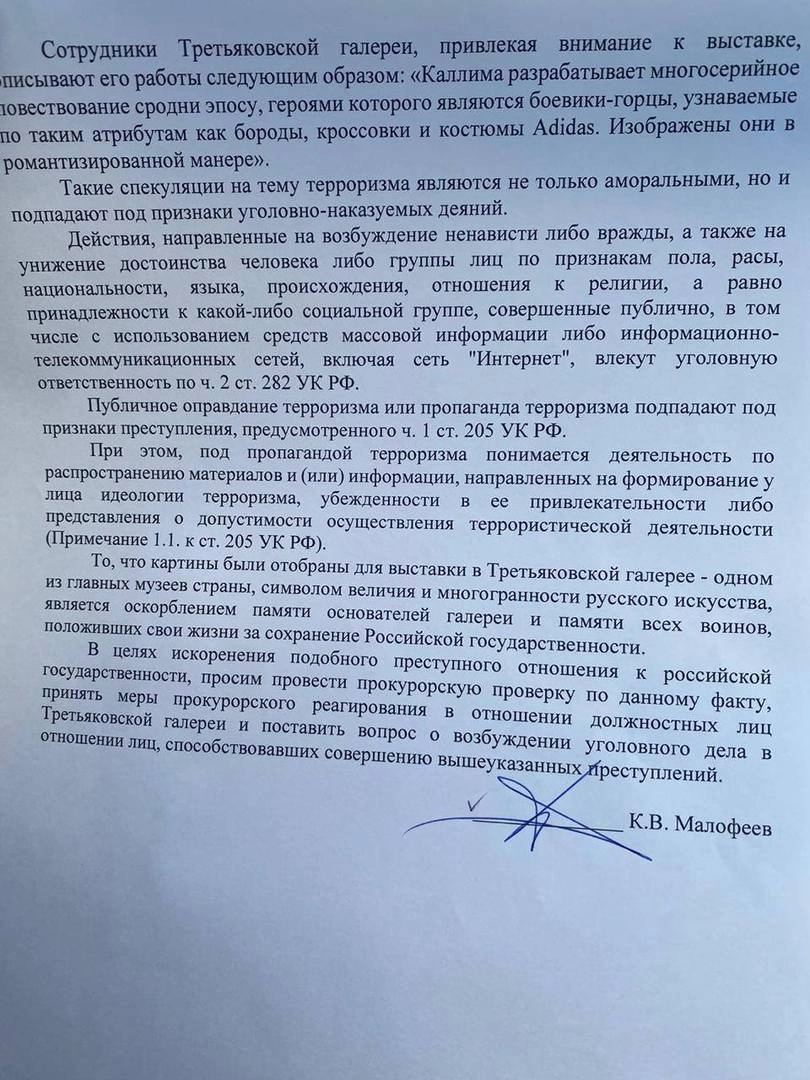Глава Общества развития русского исторического просвещения «Двуглавый Орел» Константин Малофеев подал заявление в столичную прокуратуру. Деятель требует, чтобы ведомство проверило экспозицию Третьяковской галереи, а именно картину Алексея Каллимы «Между случайностью и необходимостью», на которой, по его словам, изображен отдых чеченских боевиков. Малофеев считает, что заведение необходимо привлечь к ответственности по статье «Оправдание терроризма».