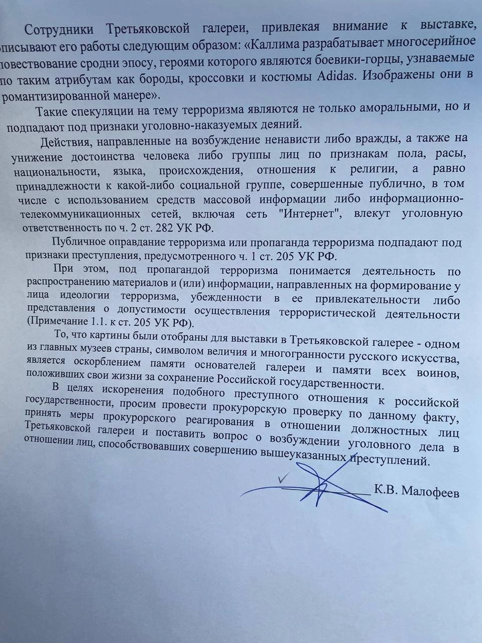 Малофеев настаивает на том, чтобы сотрудники, ответственные за подготовку выставки «Поколение XXI» в здании Новой Третьяковки на Крымском валу, были наказаны в соответствии с законом, вплоть до уголовной ответственности.