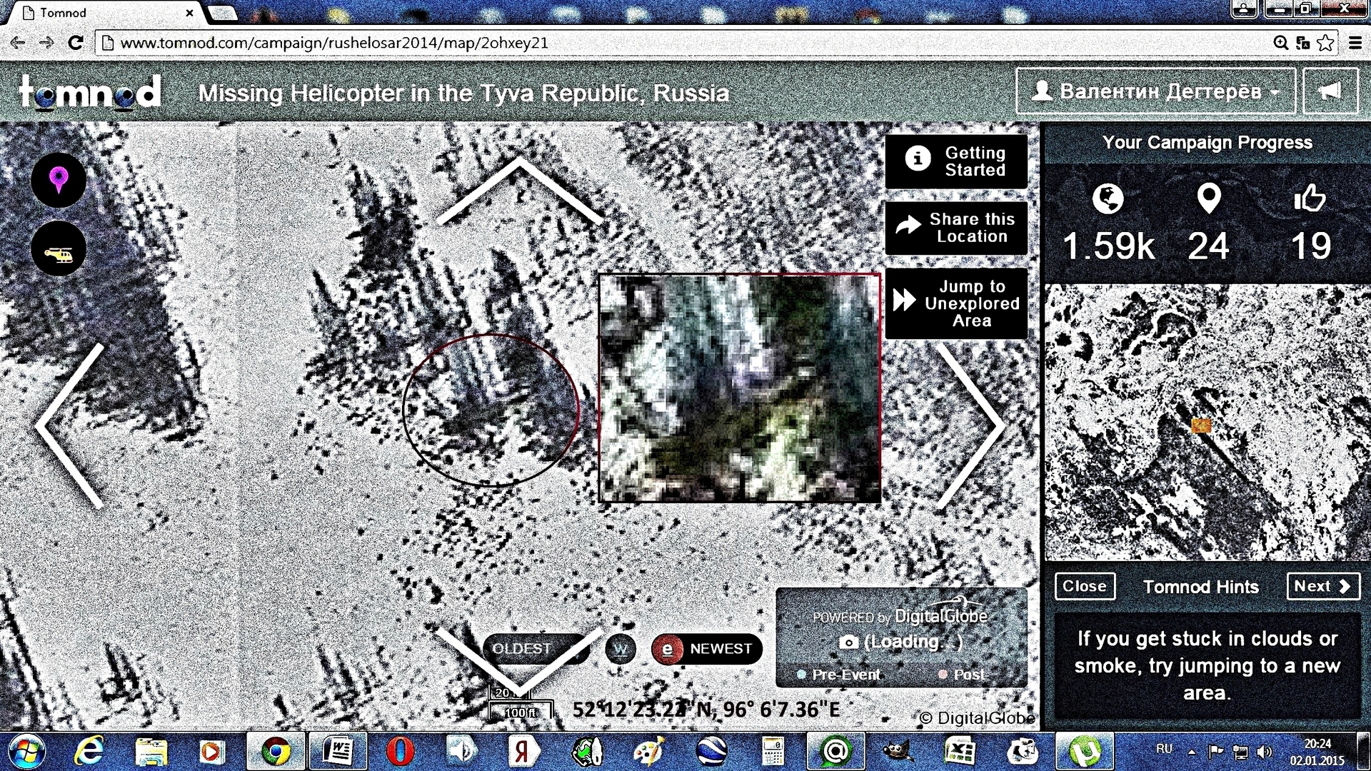 В конце ноября 2014 года сайт Tomnod организовал компанию по поиску вертолета Ми-8 Тува-Авиа. Вертолет пропал при перелете через Мюнский перевал в республике Тыва, 10 октября 2014 года. Вместе в винтокрылой машиной бесследно сгинули то ли 9, то ли все 14 пассажиров. Прошли масштабные и дорогие поисковые работы, но они ничего не дали. За все время поисков только двое дорожных рабочих заявили, что видели вертолет летевшим в сторону горного перевала. Да родные пропавших утверждали, что телефоны их родственников были в сети ещё два дня после пропажи, трубки (понятное дело) никто не брал. Последней надеждой спасателей стал некий известный шаман из Якутии. В менталитете жителей Тывы с рождения заложено уважение к шаманам, экстрасенсам и прочим представителям уважаемых в народе профессий. Поэтому надежды были огромные. Экстрасенс даже указал на ряд районов, на проверку этих мест ушло целый месяц. 16 декабря 2014 года группа из управления МЧС Тывы выходила в лес, где три дня искали пропавший вертолет, по указанию шамана. К сожалению, враждебные силы помешали экстрасенсу правильно «настроится». Поэтому там ничего не нашли. Кроме того было «сенсационное» заявление, что обломки вертолета нашли в Красноярском крае. Туда ходили, но ничего так и не нашли. Все, больше ничего по этой трагедии нет. Никаких зацепок вообще. Но 10 Декабря 2014 года на сайте Tomnod, в компании по поискам этого вертолета (такая была организована впервые) мною было найдено то, что (по всей видимости) им и является. Вертолет лежит на небольшой горе, почти закрытый деревьями, на боку. Не сгоревший, не взорвавшийся при падение. Упавший, на склон горы при жесткой посадке. Рядом прямоугольный обломок небольшого размера. Это место доступно при просмотре сайта по ссылке: www.tomnod.com/campaign/rushelosar2014/map/2ohxey21