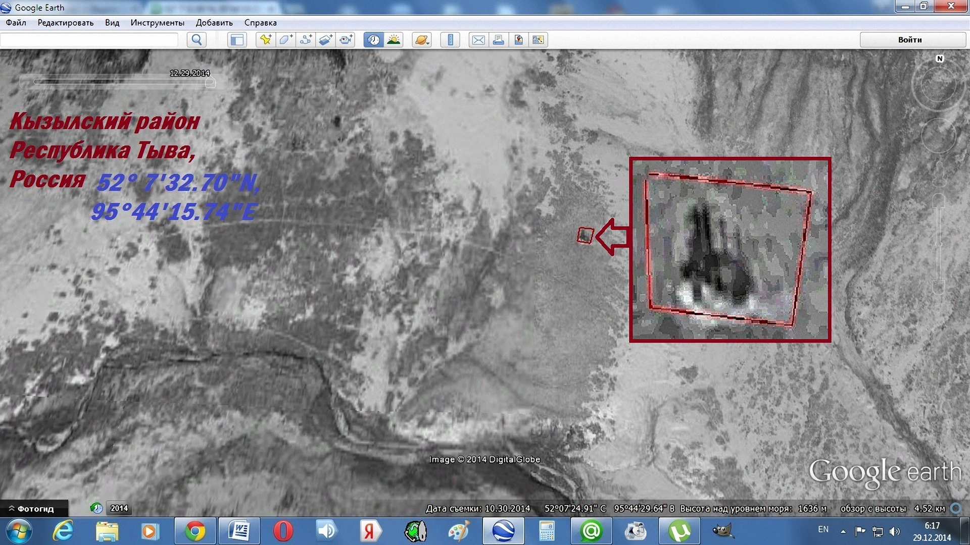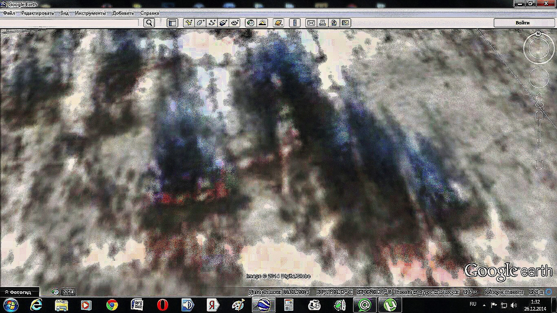 Можете, сами в этом убедится. Предмет аккуратно лежит между двумя большими деревьями. Снимок сделан в черно-белой гамме, дата проведения фотографирования 28 октября 2014 года. Предмет инородный для природной среды, скорее всего техногенного характера. Я самостоятельно нашел подобный же снимок на сайте Google Earth. Это место находится в 144 километрах от города Кызыл, в лесном урочище Дортен-Мюн, это место имеет прямое отношение к тому перевалу, на котором вертолет и искали. Но если на черно-белом снимке было хорошо видно предмет похожий на вертолет, то на снимке от 30 октября 2014 года видно было очень плохо. Вернее если увеличить карту и рассмотреть детали, то хорошо видно, что за деревьями, действительно, что-то лежит. Той же формы, что и на снимке с сайта Tomnod, размером около 20 метров. Даже небольшие прямоугольные обломки рядом видны хорошо. Координаты такие: 52°12'23.28"N, 96° 6'7.38"E как раз это середина предмета, дальше смотрите сами. За деревьями предмет хорошо видно, если увеличь снимок. Предмет похожий на обломок, явно техногенного свойства виден по координатам 52°12'23.40"N, 96° 6'6.03"E Понятно, что я потом увеличил скриншоты, добавил контрастности, повысил четкость и прочие характеристики. Почему я это сделал? Ответ простой, из-за снега. На момент съемки, предмет был почти занесен снегом, фотография сделана в пять часов утра по Европейскому времени, или в 13 часов по времени республики Тыва. Засветка большая, плюс отражение солнца от снега. Видимо поэтому в поисках Tomnod использовали черно-белые снимки. Рассмотрев все внимательно начал подозревать, что это и есть тот самый вертолет. Хотя, конечно, это может быть и строение чабанов. Одно такое же я уже видел на снимках. Беда в том, что за последние годы все зимние стоянки чабанов в Тыве были разрушены. Их осталось немного, но сейчас собираются восстанавливать. На картах МЧС эти стоянки не занесены, хотя в годы СССР там было, даже, электричество. Так, что все может быть. Второе возможное место падения ещё ближе. Оно рядом с Кызылом в 99 километрах от него, на склоне горы по координатам 52° 7'32.70"N, 95°44'15.87"E на скале есть участок с повреждением снежной поверхности, размером около 80 метров. Рваные края, не вызывают сомнение, что там могло, что-то упасть. То, что это не лавина хорошо видно, так как снег не «сполз» по склону вниз. Сравнить нельзя, других зимних снимков нет. Но если это то самое место, то все очень плохо. Так как от вертолета, видимо, ничего не осталось. Сомнительно, что телефоны пропавших людей работали после такого падения ещё два дня, даже будучи в сети сотового оператора. Хотя место это, точно, находится в зоне «досягаемости» сотовых станций.