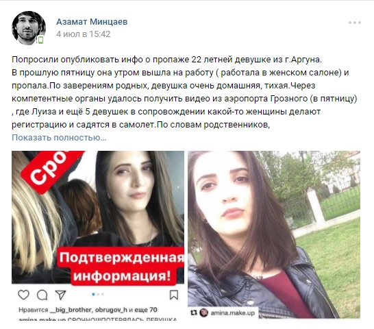 О пропаже девушки стало известно 4 июля. «Попросили опубликовать инфо о пропаже 22-летней девушки из г. Аргуна, — написал активист Азамат Минцаев. — В прошлую пятницу она утром вышла на работу (работала в женском салоне) и пропала. По заверениям родных, девушка очень домашняя, тихая».