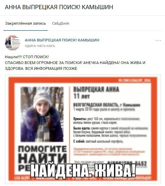 «Нашли!!! Стоп поиск», — написали добровольцы в группе, посвященной поиску пятиклассницы.