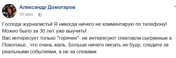 «Господа журналисты! Я никогда ничего не комментирую по телефону! Можно было за 30 лет уже выучить!Вас интересует только «горячее». Больше ничего писать не буду, следите за реальными событиями, а не за словами».