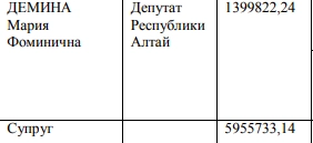 После того, как депутаты Госсобрания Республики Алтай впервые после выборов обнародовали сведения о доходах и имуществе за минувший год, выяснилось, что доход коммунистки Деминой и ее супруга составляет порядка 20 тысяч рублей в день.