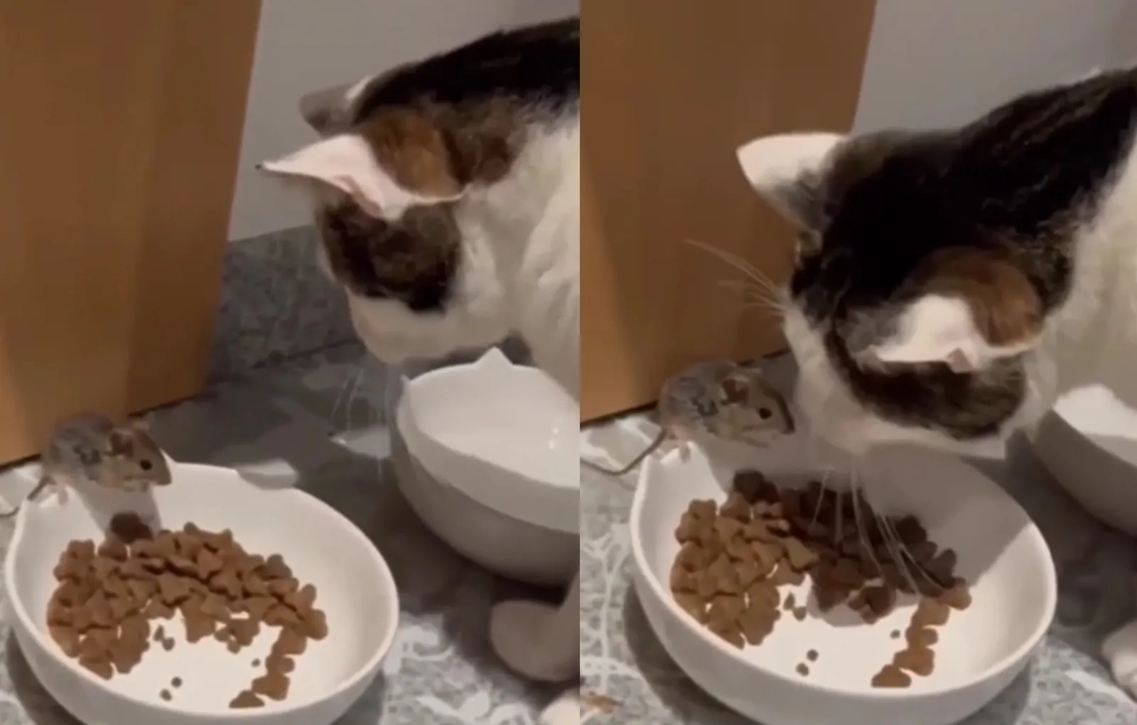 «Простите, а вы кто?»: мышка покусилась на кошачью еду и осталась безнаказанной