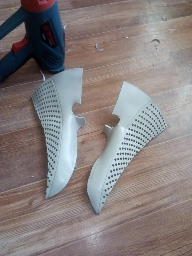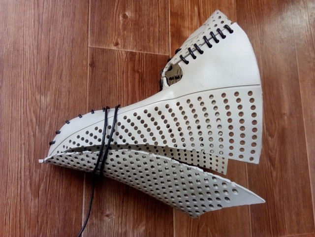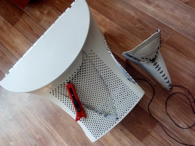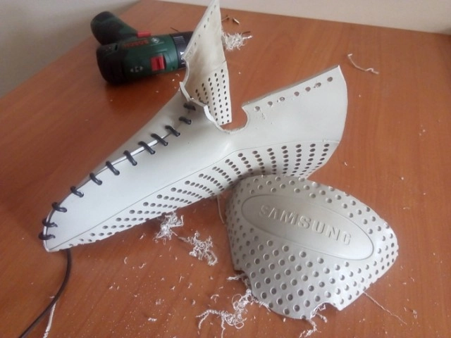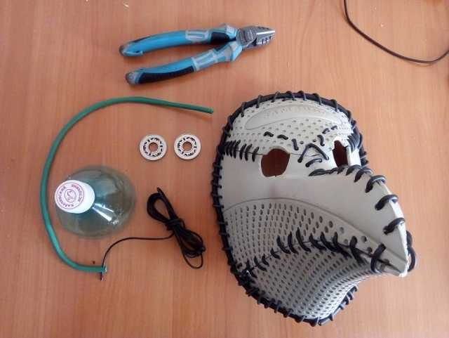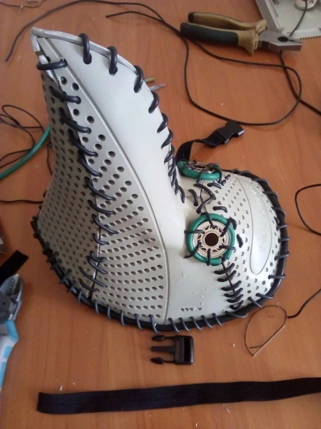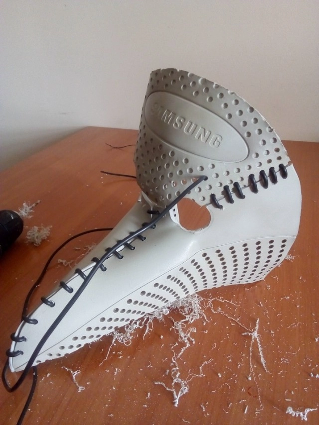 Далее сделал отверстие для глаз и соединил части маски, прошив толстым проводом от мышки