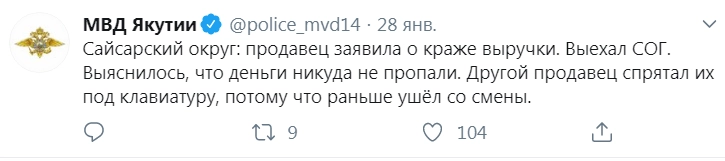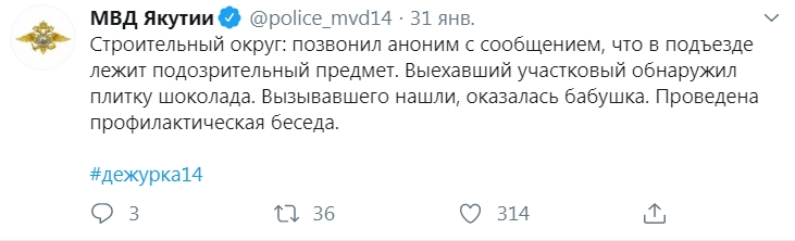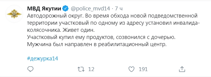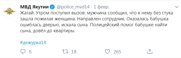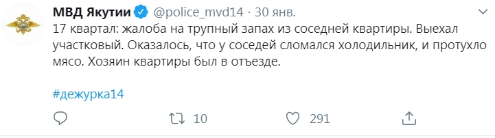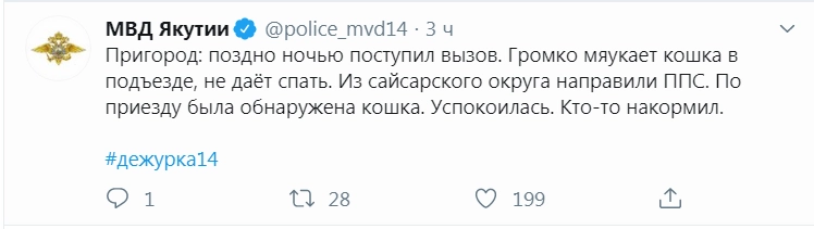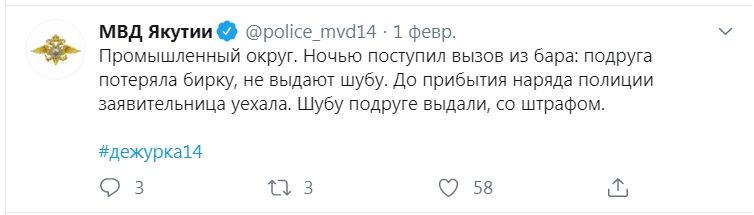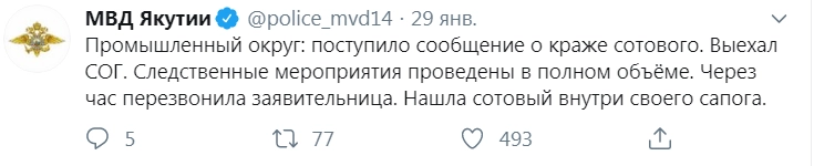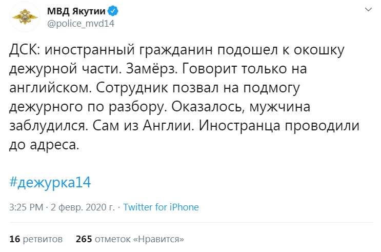 На просторах российского интернета набирает популярность официальный аккаунт якутского МВД в Twitter. От типичных серьезных государственных ведомств в соцсетях его отличает наличие несерьезных новостей и курьезных случаев, с которыми полицейские сталкиваются каждый день.