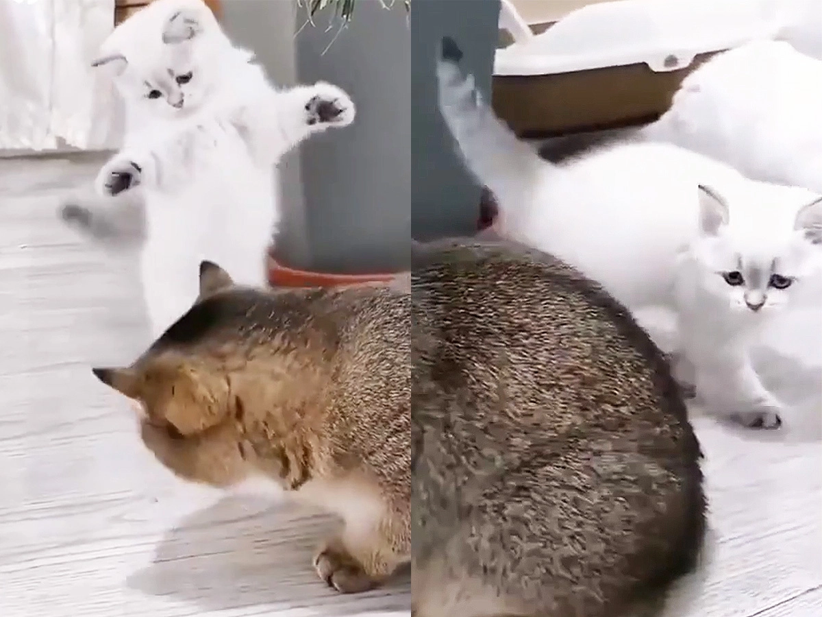 «Просто мимо проходил»: котёнок внезапно передумал играть со строгой мамой