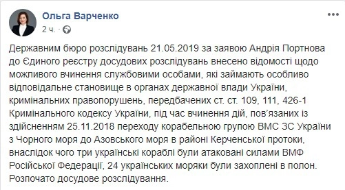 Речь идет о событиях прошлого года, когда несколько украинских кораблей прошли через Керченский пролив. Расследование было инициировано после заявления бывшего замглавы администрации Януковича Андрея Портнова, который недавно вернулся на родину.