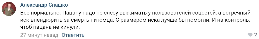 Мы похоронили собаку и поехали по домам. А через некоторое время нас с сыном вызывает следователь Ленинского РОВД. На сына возбудили уголовное дело, — поделился отец.
