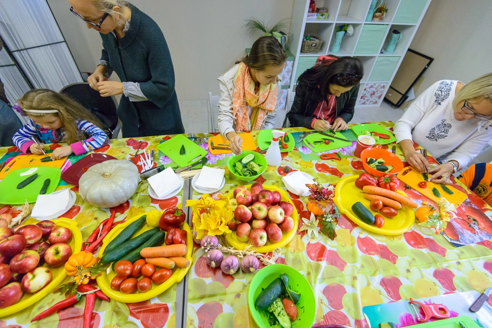 Под руководством мастера Андрея Адамайтеса все желающие вырезали розочки из огурцов и помидоров, лилии из перцев, бабочек из моркови и лебедей из яблок. Освоив «простые» овощи, участники мастер-класса смогли приступить к главному и самому сложному элементу карвинга – тыкве. Из-за твердой кожуры вырезать из нее узоры – довольно трудоемкое занятие, зато получившиеся в итоге фонарики смогут поразить всех любителей Хэллоуина.
