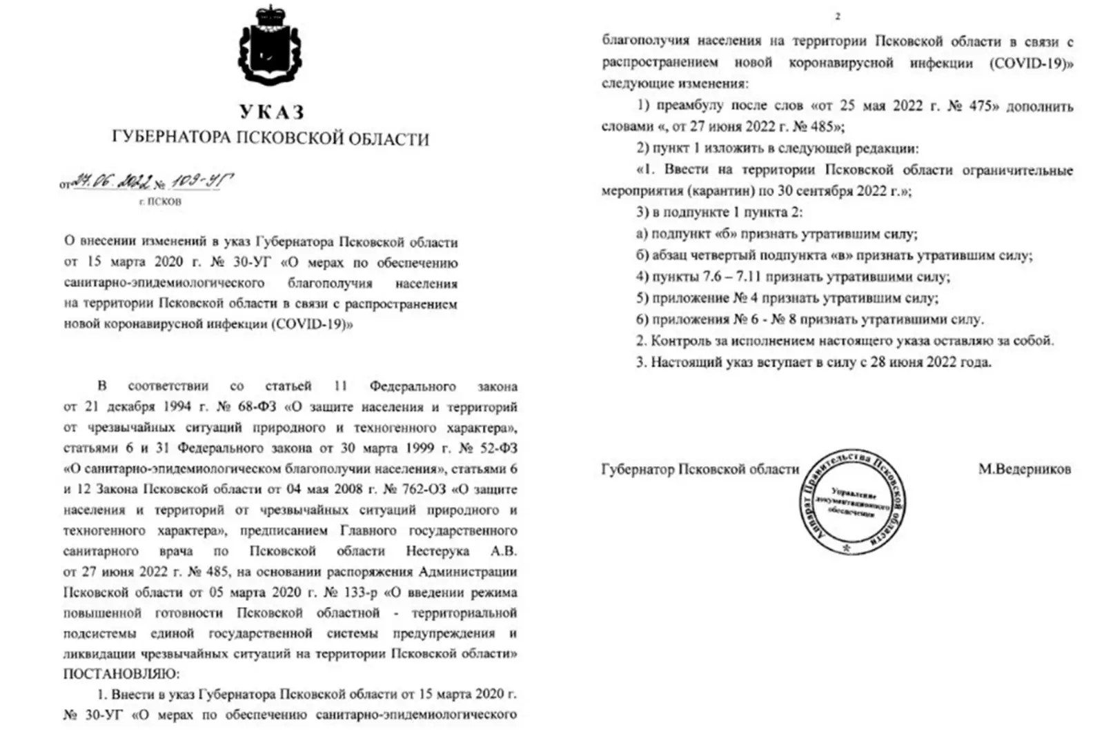 Советник губернатора Псковской области по информационной политике Антон Сергеев заявил «Ридусу», что регион не станет немедленно реагировать на решение Роспотребнадзора снять все ковидные ограничения в стране. 28 июня губернатор области Михаил Ведерников подписал указ о продлении санитарных мер, введенных из-за коронавируса, до 30 сентября.
