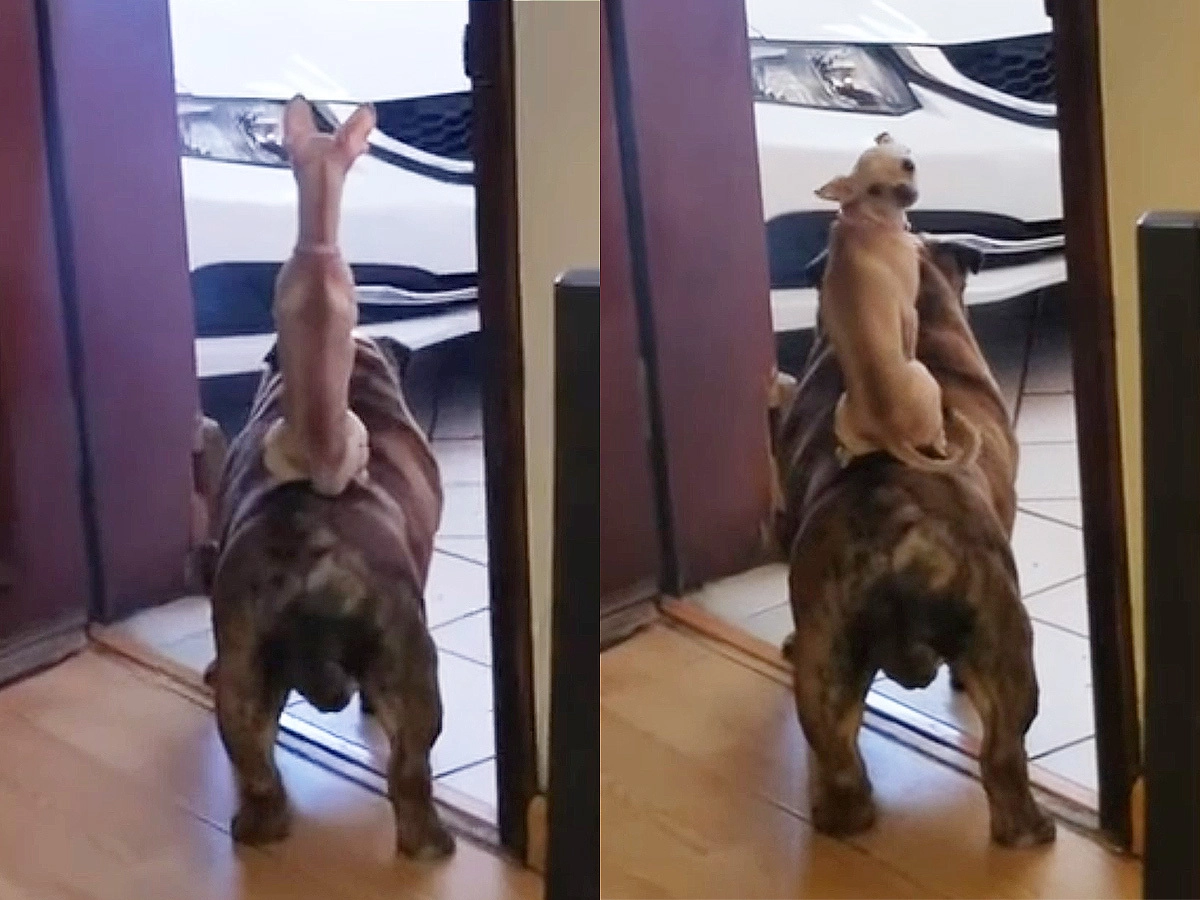 Однажды во время завтрака хозяин двух собак запечатлел забавную картину: щенок чихуахуа взобрался на спину английского бульдога, и они вместе стали лаять на прохожих. При этом питомцы стояли на пороге дома, боясь выйти на улицу. Мужчина признался, что здорово веселился, наблюдая за ними.